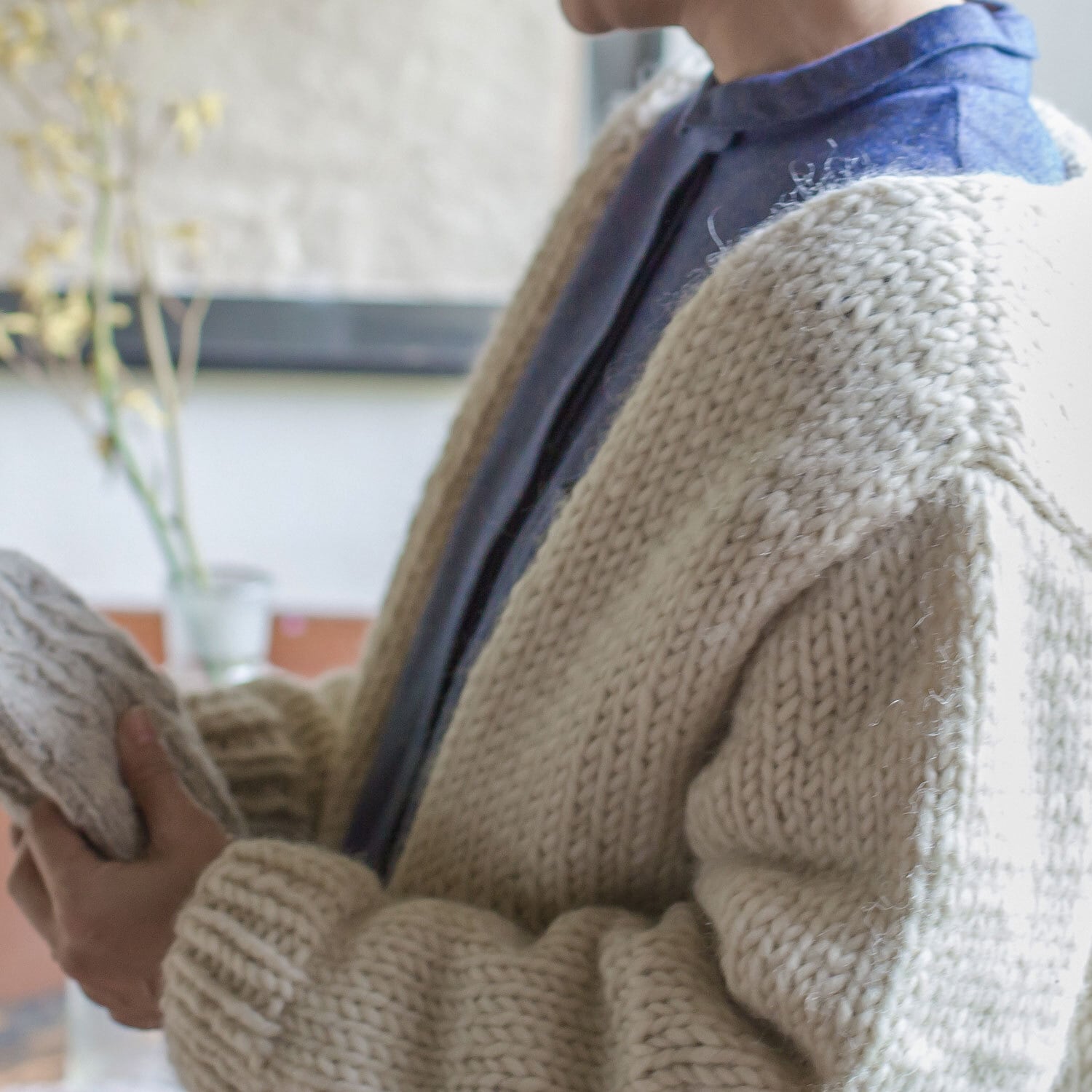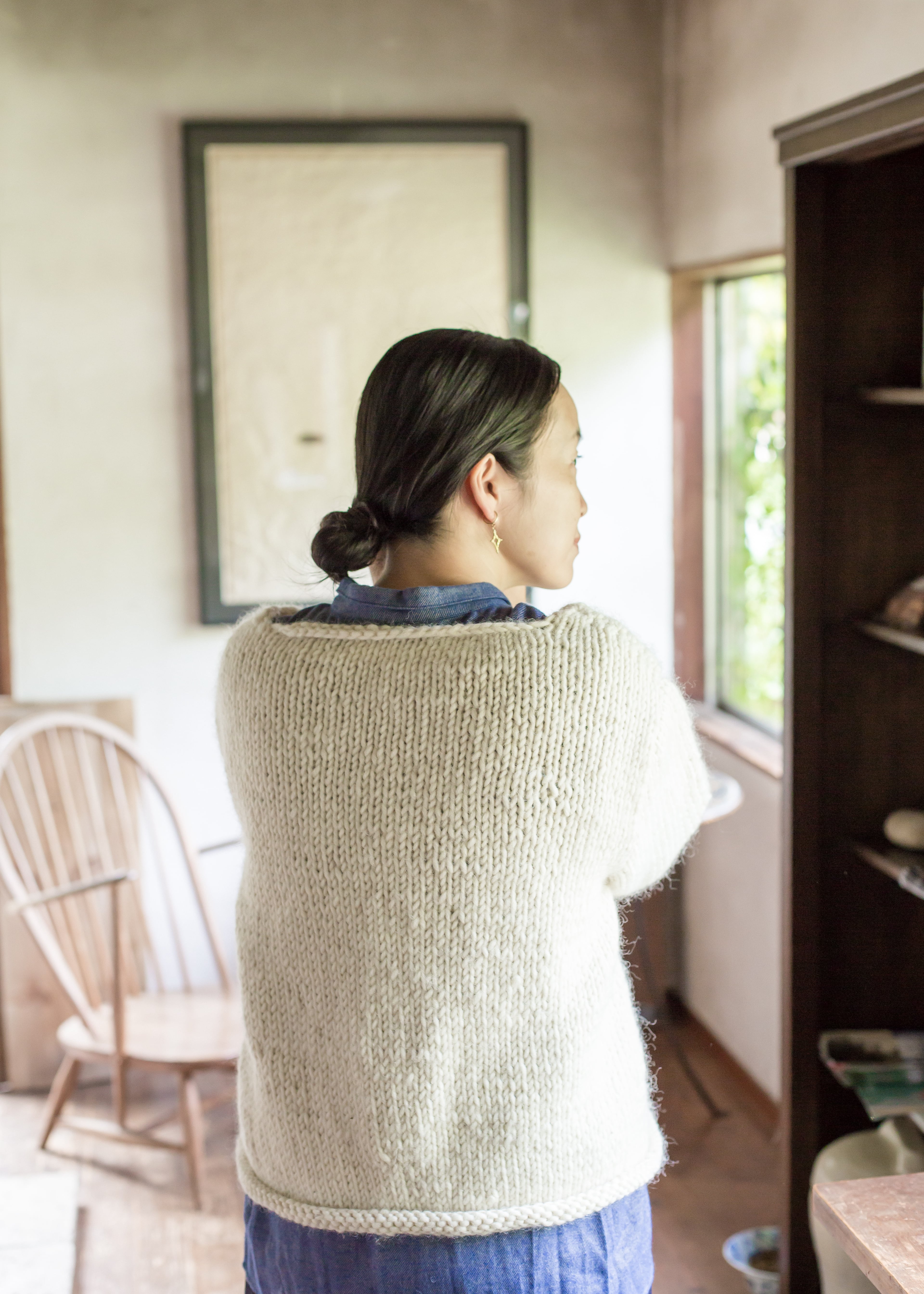 太い毛糸で編まれたシンプルなデザインが魅力のカーディガン