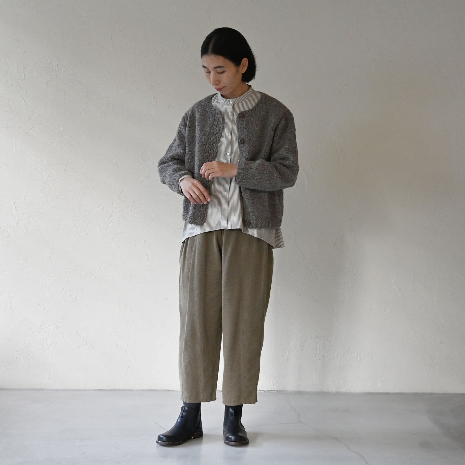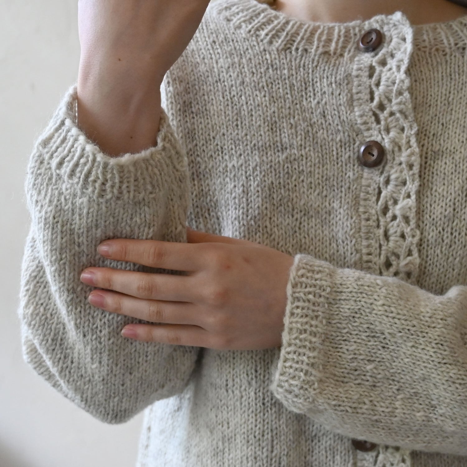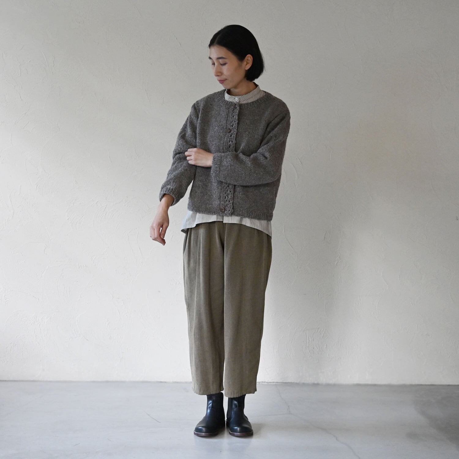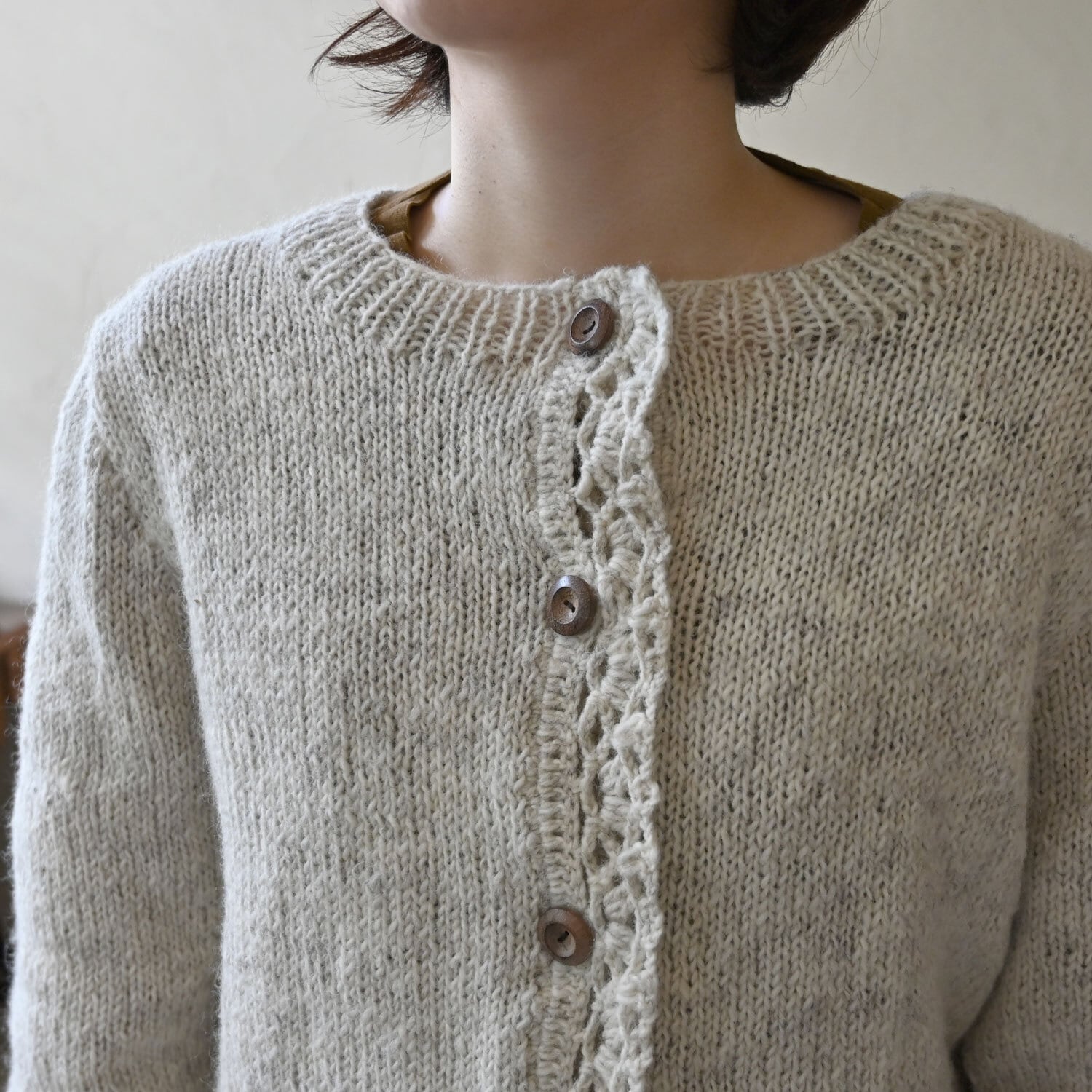 前立てに施されたかぎ針編みがポイントのカーディガン